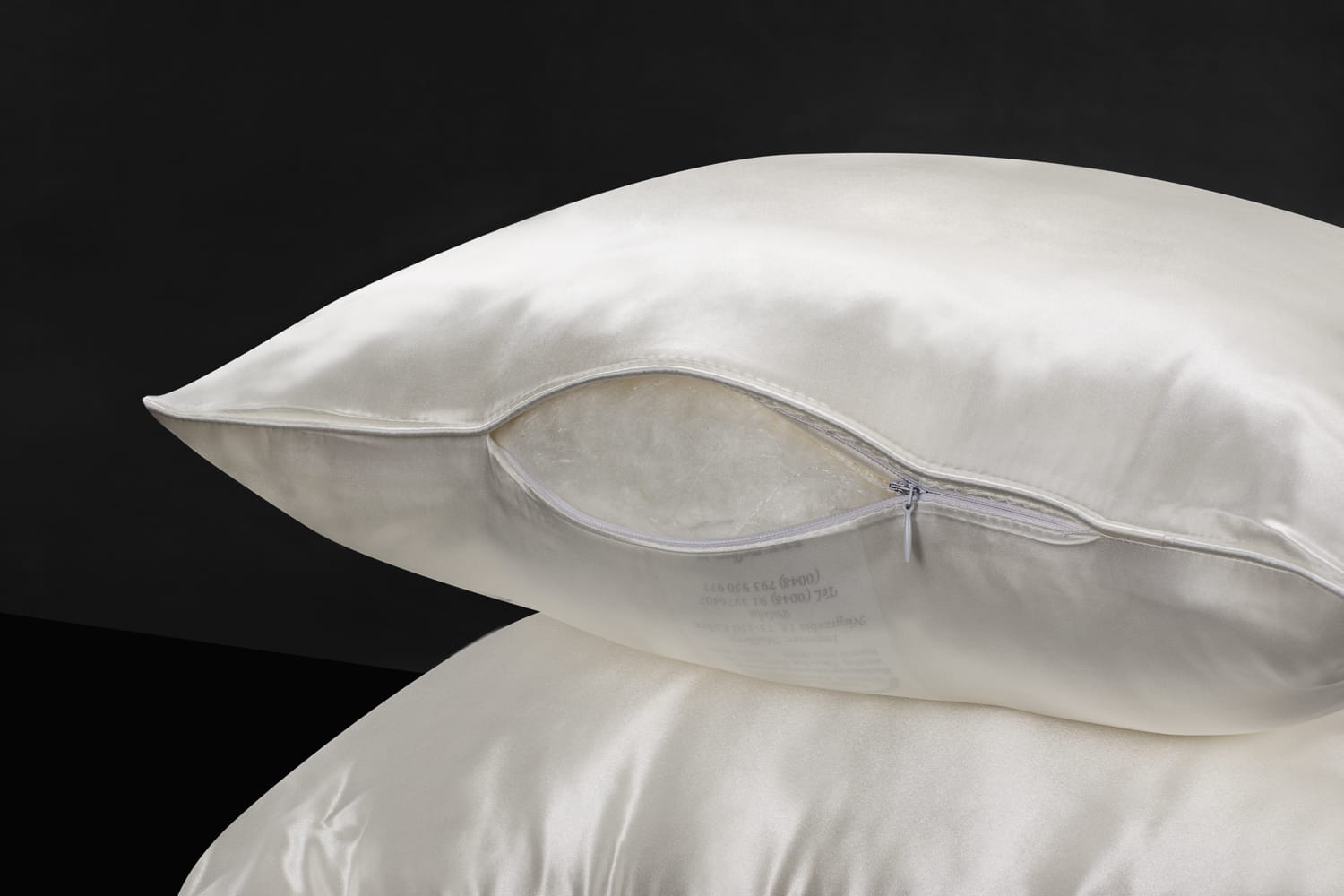 Wypełnienie poduszki: 100% jedwab naturalny morwowy (50% wkładu) + jądro poliestrowe wewnątrz zapobiegające deformacji poduszki w trakcie wieloletniego używania (50% wkładu)